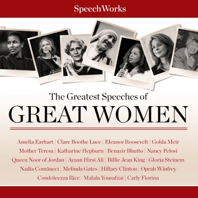 SpeechWorks presents this collection of the greatest speeches of great women. Represented here are some of the most famous women of recent history, including athletes, politicians, businesswomen, diplomats, heads of state, activists, philanthropists, and more. You will hear the actual voices of these women, recorded at public functions at which they were the featured speaker.Included are the following:Amelia Earhart, American aviation pioneerClare Boothe Luce, American author, politician and diplomatEleanor Roosevelt, American polician, diplomat, and activistGolda Meir, a teacher, politician, stateswoman, and prime minister of IsraelMother Teresa, Roman Catholic nun and missionaryKatharine Hepburn, Academy Award–winning actressBenazir Bhutto, former prime minister of PakistanNancy Pelosi, speaker of the US House of RepresentativesQueen Noor of Jordan, widow of King Hussein of JordanAyaan Hirsi Ali, Dutch American activist, author, and politicianBillie Jean King, American tennis championGloria Steinem, American journalist and activistNadia Comaneci, Romanian champion gymnastMelinda Gates, American businesswoman and philanthropistHillary Clinton, American politicianOprah Winfrey, American actress, talk-show host, and media proprietorCondoleezza Rice, American political scientistMalala Yousafzai, Pakistani activist and Nobel Prize laureateCarly Fiorina, American businesswoman